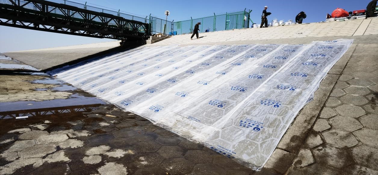 混凝土節(jié)水保濕養(yǎng)護(hù)膜,是以新型可控高分子吸水材料為核心,以塑料薄膜為載體,通過設(shè)備加工復(fù)合而成的卷材產(chǎn)品。其中高分子材料可吸收自重200倍的水分子, 吸水膨脹后變成透明的晶狀體,把液態(tài)水變成固態(tài)水,每平方米養(yǎng)護(hù)膜可蓄水0.5KG,成為一個(gè)固態(tài)的微型水庫,然后通過毛細(xì)管的作用向混凝土養(yǎng)護(hù)面滲透, 同時(shí)不斷吸收混凝土在水化過程中產(chǎn)生的蒸發(fā)水,因此在一個(gè)養(yǎng)護(hù)期內(nèi)總能保持混凝土表面濕潤。